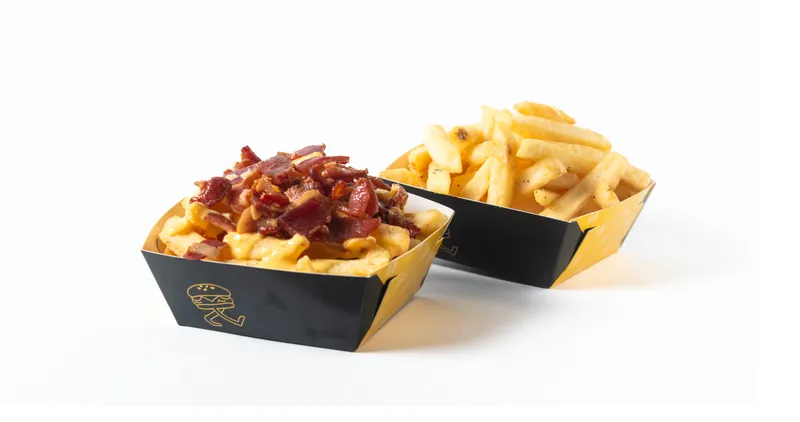 Dos burgers, dos fries, dos bebidas y salsas (mayonesa, ketchup y ají).