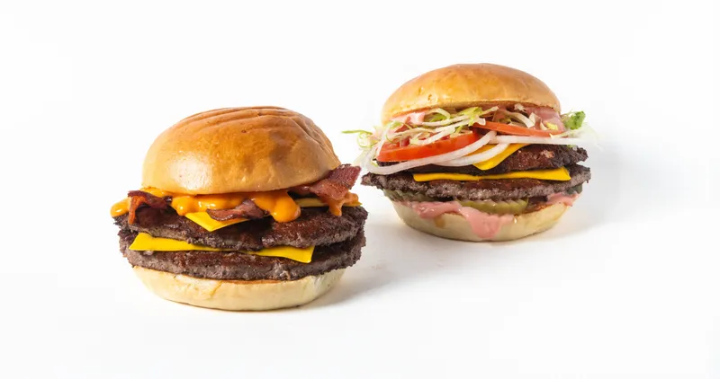 Double patty 100g c/u, doble queso cheddar, pickles, cebolla, tomate, lechuga y salsa Thousand Island.